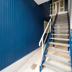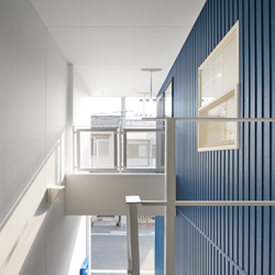 リフォーム前は共有の玄関が1階にありました。既存の玄関の上を減築し、階段と2階子世帯用の玄関を新設。玄関ドアは、1階に使用していたものを再利用しました。減築でできた吹抜けと、玄関アプローチ部分は、白とブルーを基調にしたさわやかな空間に。グレーチング階段で圧迫感を解消し、階段下は自転車などを置くスペースもできました。