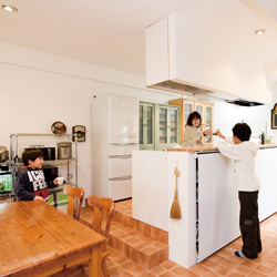 以前のキッチンは日当りがよすぎたので、位置を北側に移動しました。ステップのあるステージキッチンをご提案した。テラコッタ風の床に、カントリーテイストの家具がよく似合う、奥さまこだわりの素敵なキッチンになりました。「広くなって料理のお手伝いもしやすくなった」とお兄ちゃん。床面をあげた分、天井高をあげ、キッチンの前面の収納棚は、ロールスクリーンで目隠ししてすっきり。